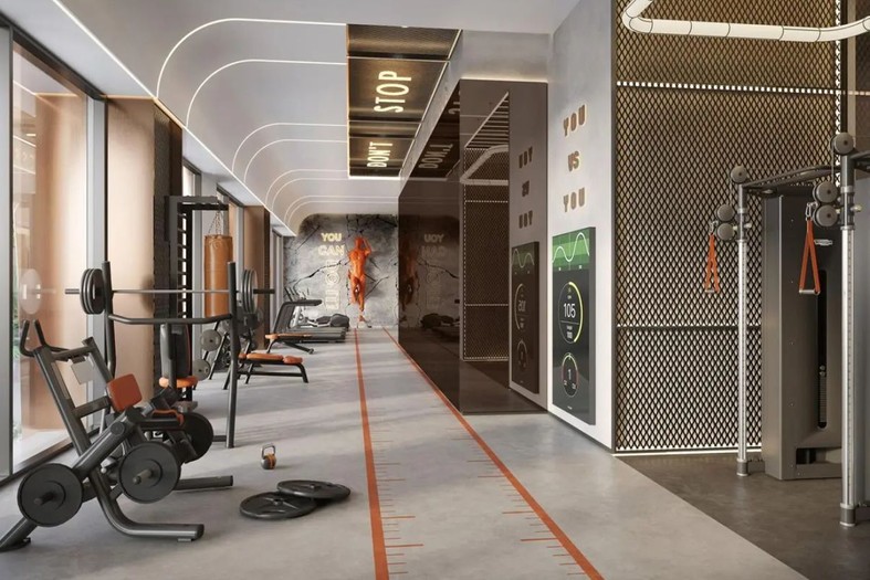 Swimming pool, gym, and landscaped outdoor spaces