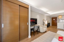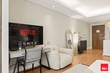 The open-plan layout maximizes space and functionality, complemented by floor-to-ceiling windows that fill the apartment with natural light.